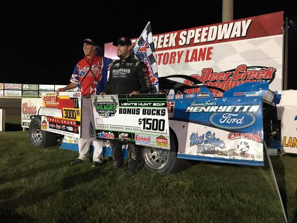 Ryan Gustin took the lead from race-long leader Travis Saurer with five laps to go in Saturday’s 40-lap main event at the Deer Creek Speedway, and went on to score his third straight victory in the USMTS Hunt for the Casey’s Cup powered by S&S Fishing & Rental.